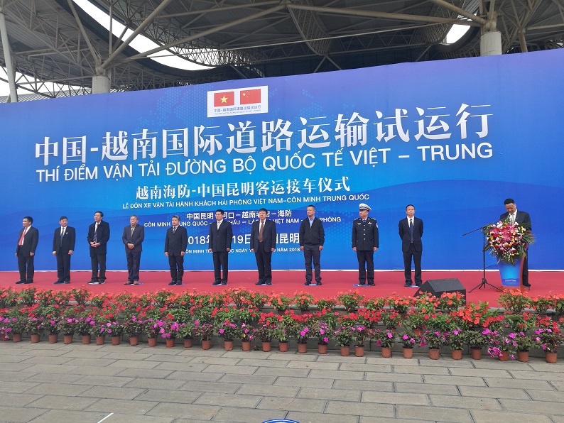 2018年9月19日上午10:00,受交通運輸部委托,省交通運輸廳在中國昆明市南部汽車客運站舉行中國昆明—越南海防國際道路客運試運行接車儀式。此次接車儀式是中越雙方交通運輸部磋商確定的中越國際道路客貨運輸試運行系列活動之一。